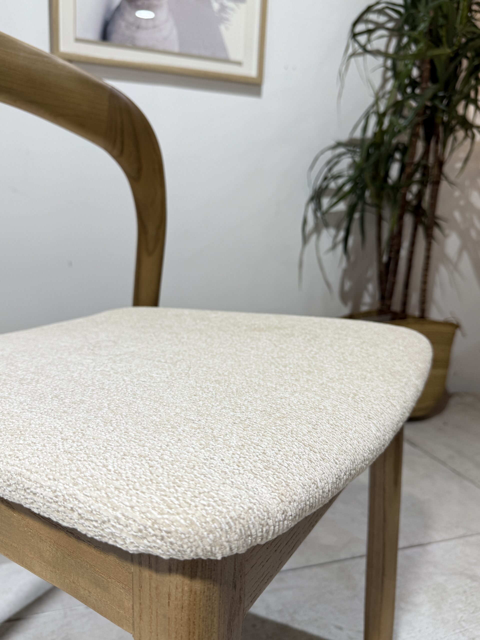 Thoughtfully designed for everyday use, it features a gently curved backrest and a cushioned upholstered seat that provide excellent comfort and support. The combination of smooth wood and soft fabric creates a harmonious balance of durability, texture, and warmth.