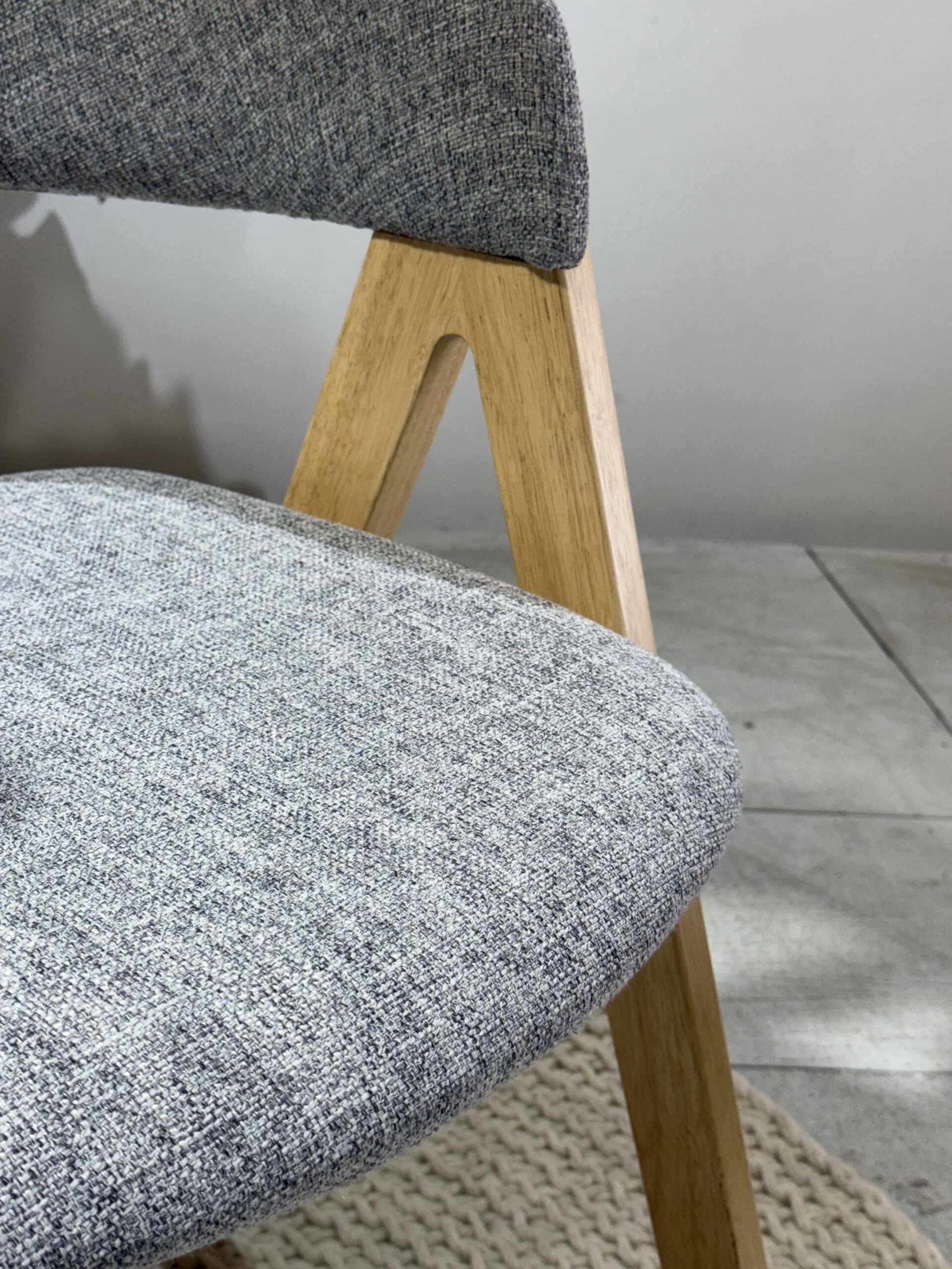Understated and versatile, the Nicole Dining Chair in grey fabric with natural wooden legs blends comfort and timeless style for everyday dining.
